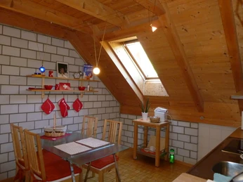 Seien sie willkommen in unserer Zweieinhalbzimmerwohnung mit Galerie, Wohnraum mit Balkon, Schwedenofen und begehbarem Kleiderschrank. Die grosse Wohnküche ist gut ausgestattet ohne Spülmaschine. Das Badezimmer ist mit Dusche, WC und Waschmaschine / Tumbler bestückt. Internetanschluss ist vorhanden, aber kein Fernsehen. Geschlafen wird auf der Galerie. Es sind ein Doppelbett und zwei Kinderschlafplätze vorhanden. Im Haus darf nicht geraucht werden. Haustiere nach Absprache.