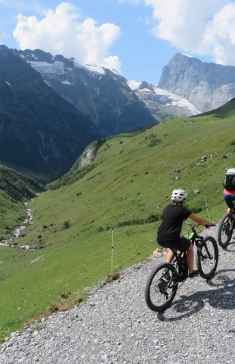 Der Bahnhof Engelberg ist Startpunkt der E-Biketour Engelberg. Los geht’s flach durch das Dorf am Kloster vorbei, auf der leicht steigenden Strasse der Talstation Fürenalpbahn entgegen. Das Tal wird enger und die Unterlage wechselt nach ca. 1.5 km auf Kies. Stetig steigend geht’s vorbei an der Herrenrüti zum Restaurant Alpenrösli. Hier empfiehlt sich einen Halt, das Bergbeizli ist für seine Rösti und die guten Desserts bekannt. Vor dem letzten, kurzen aber steilen Aufstieg zum Stäfeli wird der E-Bike-Antrieb das erste Mal richtig gefordert, mit den imposanten Spannörtern vor Augen lässt sich das Stück mit dem groben Kies und der starken Neigung aber gut bewältigen. Bei der Alp Stäfeli führt die Kiesstrasse rechts weg und quert den Stierenbach. Ab da geht’s auf der rechten Talseite über die neue Forststrasse auf und ab, vor den Flanken der Spannörter vorbei dem Wasserfall Stäuber entgegen.