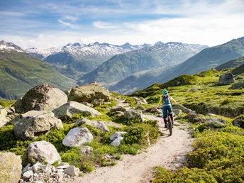 Die Tour führt vom Bahnhof Andermatt durch den Talboden in Richtung Realp, wo der Weg hinauf bis Tiefenbach ansteigt. Jetzt sind Single-Trails angesagt. Der ausgebaute Trail führt von Tätsch weiter bis in die Talmulde des Lochbergs und weiter im auf und ab zum Lutersee. Als Belohnung wartet dort ein atemberaubender Panoramablick. Anschliessend führt die Tour talwärts entlang des Golfrundweges auf den Reussdamm in Richtung Giessen und zurück zum Bahnhof Andermatt.