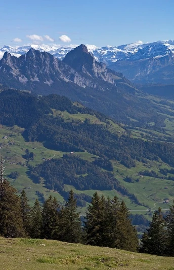 Vom Wildspitz aus geht es über die Halsegg runter nach Sattel. Von der Talstation der Drehgondelbahn „Stuckli Rondo“ gelangen Sie auf einem gut markierten Wanderweg auf den Mostelberg