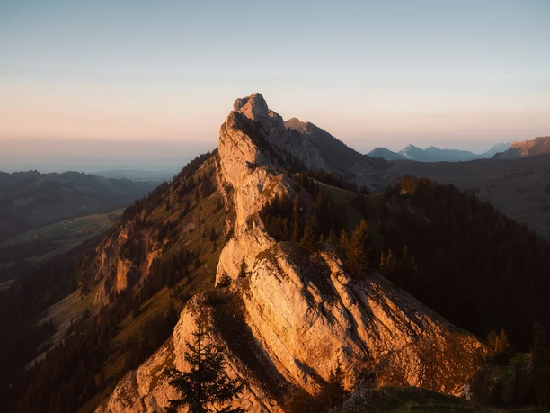 Nach der Schwändelifluh beginnt der Abstieg Richtung Vorderrüüchi, über Alpweiden und steinige Wege, später durch lichten Wald. Bei der Vorderrüüchi öffnet sich nochmals der Blick zurück auf die Fluh und das bereits begangene Gratstück.