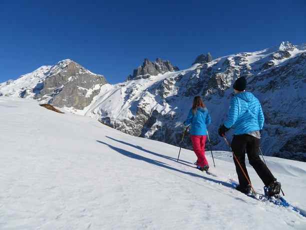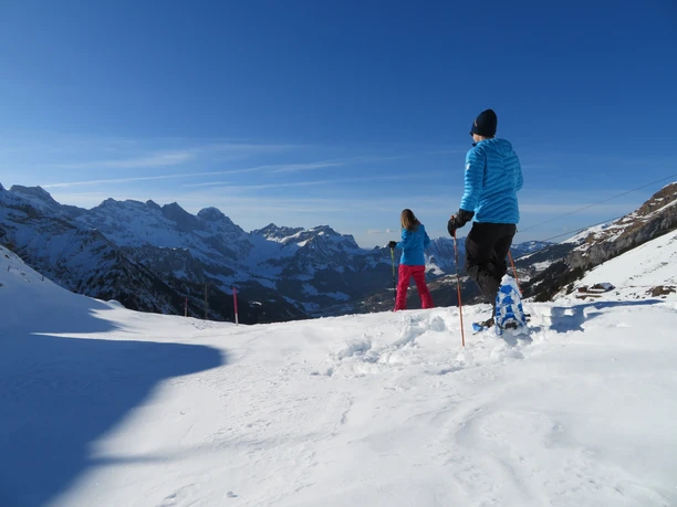Die Ruhe der Natur und pures Wintervergnügen warten auf der Fürenalp auf alle Schneeschuhbegeisterten. Ab Bahnhof Engelberg bringt Sie der kostenlose Ortsbus bis zur Talstation Fürenalp. Hier können bei Bedarf auch gleich Schneeschuhe und Skistöcke gemietet werden. Die kleine Luftseilbahn bringt einem auf die Fürenalp, zum Startpunkt der Schneeschuhtour. Los geht es gleich bei der Bergstation, leicht abwärts unter der Bahn durch und alles entlang dem Grat. Dieser Wegteil bietet eine herrliche Aussicht auf die Spannörter, die mit ihren aufragenden Zacken an die Dolomiten erinnern. Es gilt den Fotoapparat bereit zu halten und die Stille der Natur aufzusaugen. Nach ca. 2 Kilometer steigt es kurz an, aber ist die Anhöhe erreicht, hat man die Hälfte der Strecke geschafft und es geht alles leicht abwärts zurück zum Ausgangspunkt. Die Aussicht ist auf dieser Seite nicht minder schön, wandert man doch dem Titlis entgegen. Von da aus ist sein imposanter Gletscher am besten zu bestaunen. Angekommen beim Bergrestaurant lädt die warme Stube zum aufwärmen und schlemmen ein. Zurück ins Tal geht’s anschliessend wieder mit dem nostalgischen Bähnli.