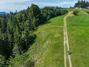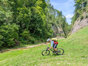 Ab Farner wird die Abfahrt nochmals abwechslungsreich. Man verlässt die Asphaltstrasse und folgt einem Wiesenweg, der sich bald in einen schattigen Forstweg mit dichtem Wald verwandelt. Dieser Abschnitt ist steiler und von grösseren Steinen durchzogen. Eine technische Herausforderung, die sich lohnt. Den hier offenbart sich ein echtes Naturschauspiel. Der Weg schlängelt sich durch eindrucksvolle, von der Nagelfluh geformte Schlucht und einem kleinen Wasserfall.