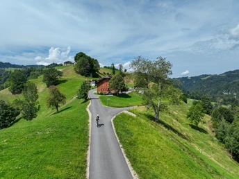 Nach einem letzten Anstieg führt der Weg zurück nach Romoos. Wer mag, kehrt im Restaurant Kreuz ein und kann sogar sein E-Bike-Akku laden.
