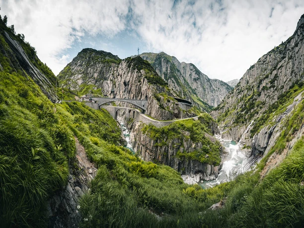 Der Klettersteig Diavolo hat eine Schwierigkeit K2-3 und ist somit ideal auch für Einsteiger. Vom Bahnhof Andermatt aus ist der Zustieg in der Schöllenenschlucht in rund 20 Minuten zu Fuss erreichbar. 700 Meter Drahtseil, 265 Eisenstifte und Haken, künstliche Tritte und zwei Leitern erwarten die Kletterer. Der Beginn ist steil und recht luftig über eine markante Rippe in gestuftem Gelände. Es folgen dann im Wechsel plattige Felsen und Grasbänder. Packend sind die Tiefblicke in die Schöllenenschlucht mit der Teufelsbrücke.