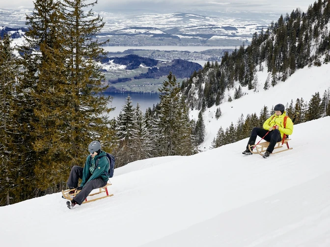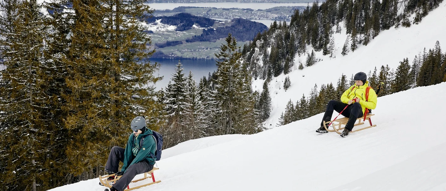 Der längste Schlittelweg der Region Klewenalp beginnt bei der Bergstation Klewenalp. Sie fahren mit der Luftseilbahn von Beckenried zur Klewenalp und spazieren dem Winterwanderweg entlang. Beim Röthenport beginnt der Schlittelweg und führt hinunter ins Ängi-Tal. Anschliessend führt ein kleiner Aufstieg nach Twäregg. Ab Twäregg schlitteln Sie dann durch den Wald zur Stockhütte hinunter. Von hier können Sie weiter, grösstenteils durch den Wald, nach Emmetten schlitteln oder mit der 6er-Gondelbahn von der Stockhütte nach Emmetten fahren. Das Postauto bringt Sie von Emmetten zurück nach Beckenried