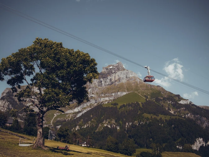 In kürze erreichen Sie schon den Sieben Quellen Weg, dieser führt Sie entlang des Bachs, wo frisches Alpenwasser im Schatten schöner Laubbäume zu Tage tritt, hinunter zur Talstation der Brunni- Bahnen.
