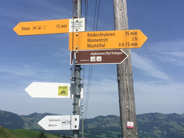 Von der alten Bergstation der Standseilbahn links Richtung ehemaliges alpines Schwimmbad. Weiter talwärts bis zur Asphaltstrasse, auf der Sie rechts Richtung Brunnerboden abzweigen. Von da aus gehen Sie die Naturstrasse rechts Richtung Restaurant Klingenstock und dann über den Sternegg zurück ins Dorf Stoos.