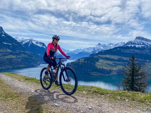 Der Urmiberg bildet den östlichen Ausläufer der Rigi-Kette. Seine Hänge sind von der Sonne verwöhnt, selbst die im Wald gelegenen Trailabschnitte trocknen nach Regenfällen schnell ab. Das ist von Vorteil, denn die Trails sind technisch zwar nicht superschwer, aber sie verlaufen teilweise über Wurzelwerk. Nach dem Start in Brunnen geht es aber gemütlich der Muota entlang nach Unterseewen. Der nachfolgende Anstieg führt in idealer Steigung hinauf zum Brunniberg. Was nun folgt, gehört zum Feinsten, was MTB zu bieten hat: abwechslungsreiche Wald- und Wiesentrails in sensationeller Aussichtslage oberhalb des Sees.