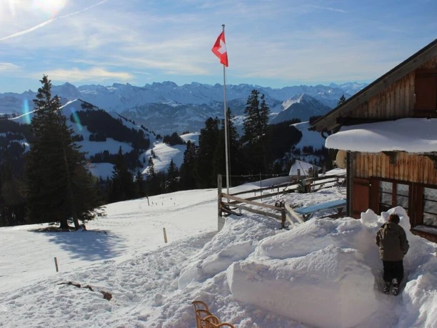 Statt von Rigi Kulm direkt der Bahn entlang nach Rigi Staffel zu gelangen, empfehlen wir zuerst den Abstieg auf dem ausgeschilderten Trail zur Kulmhütte. Von dort führt ein breiter Winterwanderweg in Richtung Rigi Staffel, wobei wir noch einen kleinen Abstecher entlang von Feldstrassen mitnehmen. Vom Staffel geht’s der Bahn entlang zur Staffelhöhe. Dann folgt der stets gut ausgetretene winterliche Panoramaweg bis zum aussichtsreichen Rigi Känzeli, von wo ein gepfadeter Winterwanderweg nach Rigi Kaltbad führt.