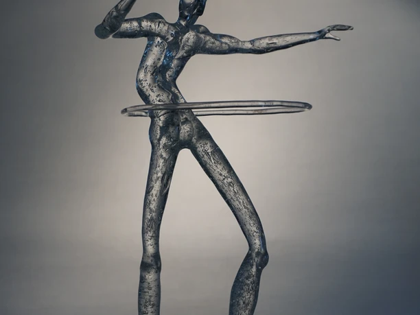 In addition to the figures that embody inwardness and emotional states, the artist also devotes himself to physical activities or everyday actions. This group of works is exhibited on the third floor. Here, visitors encounter glass people in motion: they play sports - for example with a hula hoop or on a motorcycle -, walk their dogs or playfully interact with traffic signs. After the intensive examination of the emotional figures, this part of the exhibition opens up an amusing and humorous perspective.