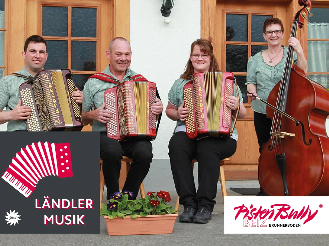 On Thursday, 19 March 2026, the Schmid Frutigen folk quartet will be playing at the PistenBully Beiz Brunnerboden from around 11:00 a.m. to around 4:30 p.m., providing excellent entertainment with traditional Swiss folk music.