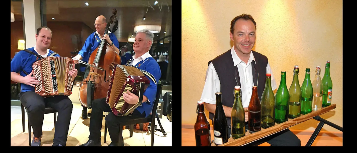 The Echo vom Vitznauerstock, which has been cultivating the cultural heritage with accordion, Schwyzerörgeli and bass for almost 50 years, has developed its own Vitznauerstock sound over this long period. Several albums have also been produced over the years. In addition to many of their own compositions, they also like to play pieces by other composers. If the opportunity arises, the well-known bottle player Toni Bürgler also plays along. He plays ten normal liter or wine bottles that are tuned to the right tone with water. The pieces of music were specially composed by Toni Bürgler senior for the bottle game. Martin Waldis also takes part with his Büchel and alphorn.