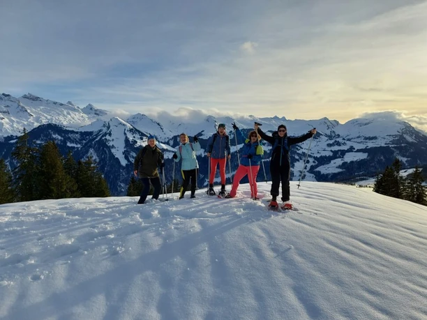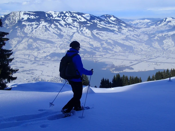 Fantastic snowshoe hike in central Switzerland. Start in the morning and head up into the mountains in the glorious winter sunshine. A magnificent view over snow-covered landscapes and a wonderful view over the mountain panorama reward the effort.