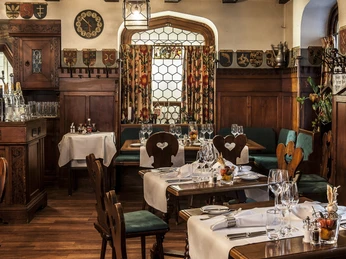 Steeped in history, the Burgerstube embodies the essence of Lucerne in an agreeable ambience. Dark wood, ornamentation, bottle-glass panes in the windows; the dining room is much the same as it was when first furnished in the Neo-Gothic style back in 1908.