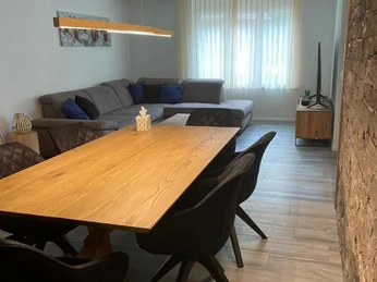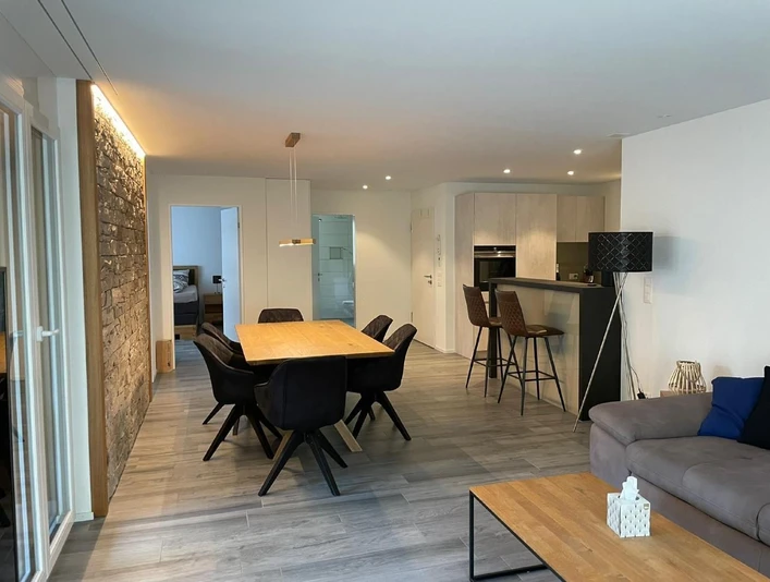 The modern kitchen is fully equipped with an induction hob. You will also find a Nespresso coffee machine, a raclette oven and a fondue set. Enjoy a delicious aperitif at the bar after an eventful day. The bright, cosy living and dining room is furnished with a table and 6 chairs (two folding chairs are available if required), a pull-out sofa (which can also be used as a bed) with a coffee table and a TV. There is a table with 6 chairs on the covered balcony.
