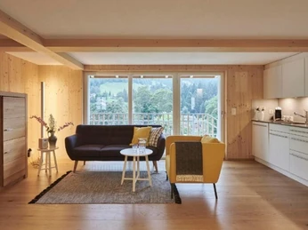 Number of persons 4-6: A baby cot (up to 2 years) is available. The house can accommodate six guests (plus baby). There is one double room and one four-bed room available. The large living/dining room/kitchen opens out onto a terrace with a beautiful view of the surrounding meadows and woods. In the large bedroom, a sofa can be converted into a very comfortable double bed if required. The bathroom with shower and toilet offers modern comfort. The floors are made of wood, which is why we recommend good slippers. The house was built in 1845 and therefore it can happen that the floors creak and that you can hear the neighbours on the floor above from time to time.