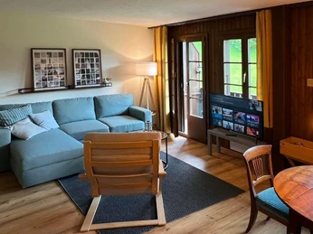 Chalet Oasis is located between the top tourist destinations of Interlaken and Lucerne. Perfect for an unforgettable holiday! Ideal for guests looking for relaxation and recreation. In order to preserve this atmosphere, we emphasise a quiet way of living. We are looking for quiet, considerate guests who appreciate our peaceful surroundings. Noisy activities or other disruptive behaviour are not welcome. This is a completely renovated and furnished 2½-room flat in a chalet. Absolutely quiet location with a view of the greenery, nestled in the mountains and away from traffic and the main road to the Brünig Pass. Everything is very cosy and lovingly furnished with lots of wood. The bedroom has a large 180x200cm king-size bed with box-spring mattress. The flat has a fully equipped kitchen that leaves nothing to be desired. From the kitchen and the living room you have direct access to the spacious, sunny balcony with dining table and small seating area. Chalet Oasis is a 17-minute walk from Kaiserstuhl OW railway station, which is why we generally recommend travelling by car. We provide a covered garage space for your car free of charge. The flat is designed for a maximum of 2 people. The laundry room is part of the holiday complex and is located in an outbuilding. The washing machine and tumble dryer work with a coin-operated machine.