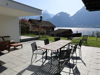 We are offering a dream villa with direct access to the lake in Sisikon, directly on Lake Lucerne with an idyllic panoramic view of the lake and mountains. You have an unobstructed view of the mountain landscape and the lake. A private bathing area on the lake with bathing ladder is available for your use. The house is fully furnished and modernly equipped. All you need to do is bring your suitcases. On the ground floor is the living area with kitchen, conservatory and guest WC. Direct access to the private garden, from which you also have direct access to the sunbathing lawn by the lake. The garden is equipped with a dining table and sun loungers, parasol and barbecue. It is also possible to book the villa for 1-4 people with reduced space. Depending on the number of people or your individual needs, the available space can be customised and individual bedrooms and bathrooms can be booked. When booking for 1-2 people, you will receive a bedroom with en suite bathroom and separate guest WC as standard. For 3-4 people, a second bedroom and a second bathroom. For an additional charge, a third bedroom can also be booked according to your requirements.