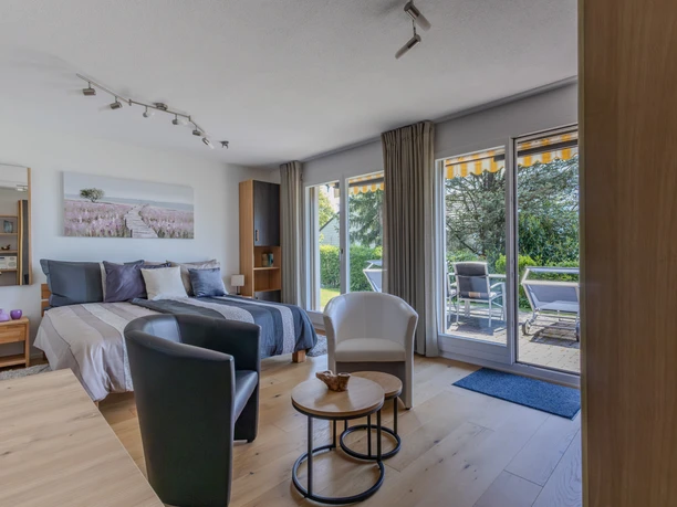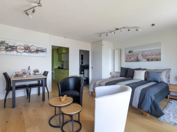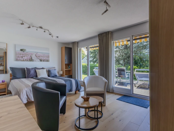 Discover the beauty of Central Switzerland from our newly furnished, sunny, and bright one-room apartment with a breathtaking view of the lake and mountains. Private entrance and garden seating area with sun loungers.