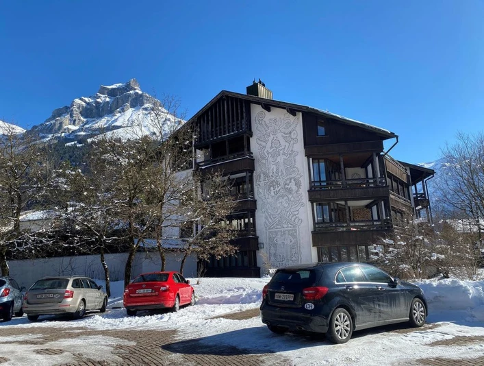 135 m2. More information by the provider: The very bright 4-room attic apartment (135 m2) was redesigned in a timeless, luxurious and elegant manner by the award-winning architect Özgür Keles (Biuld Inc.). The apartment is located on the 4th floor of house number 2 in the village settlement "Am Dürrbach", which is one of Engelberg's architectural and artistic attractions. The internationally known Sgrafittos of the Bündner artist Staivan Könz (who as a child was the model of the famous Schellenursli) and the very individual architecture of Albertus Magnus Caviezel make the settlement a very special place. Handcrafted fixtures, high-quality furniture and personal details create a cozy and at the same time light atmosphere in the flat. The large window front offers a spectacular view of the Engelberg Alps. The facility is located directly at the valley station of the Brunni Bahnen and about 10 minutes walk from the village center. The village settlement has an indoor swimming pool, fitness area, sauna and solarium. On two floors the apartment has, an entrance hall with cloakroom, a large living room with sofa, TV, Internet, dining area and fully equipped kitchen with dishwasher, Nespresso coffee maker and kettle. In addition, 2 bathrooms with shower / WC and bathtub. fireplace, 6 beds in 3 bedrooms, south-east-facing balcony (17 m2). 1 parking place is in the underground car park + parking spaces in front of the house. Ski storage. Washer and dryer in the house. Pets are not allowed. NON-SMOKING APARTMENT. Free WiFi. House / Residence - Ski lift 140 m 4-room attic apartment on 4th floor (135 m2): 3 double rooms, living room, open kitchen and 2 x bath/WC. Included: Bath- and kitchen towels, local tax, garage, use of swimming pool. Exlcuded: Baby cot CHF 20.00, deposit of CHF 300.00 with credit card, use of washing machine and dryer, solarium and sauna.