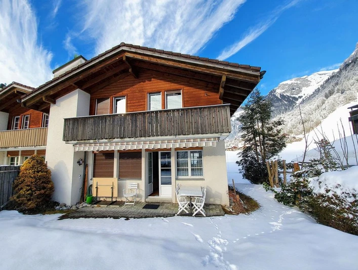 121 m2. More information by the provider: Terrace-house with 4 rooms with garden, sunny located, 2km to the centre, 200m to the skibus-stop. On the ground floor big living room with fireplace and upholstered furniture, wifi. Dining kitchen with dishwasher and shower-toilet. On the 1st floor bath-toilet, balcony and 3 bedrooms (1 double room, 1 twin room, 1 room with grandlit 160cm). Terrace. Pets not allowed. NON-SMOKING APARTMENT. 4-room apartment, terrace-house: On the ground foor: living room, dining kitchen, shower-toilet. 1st floor: 3 bedrooms (1 double room, 1 twin room, 1 bedroom with grandlit 160cm), bath-toilet. Included: Bath- and kitchen towels, local tax. Excluded: Telephone calls, deposit CHF 200.00.