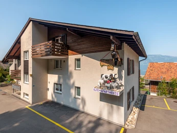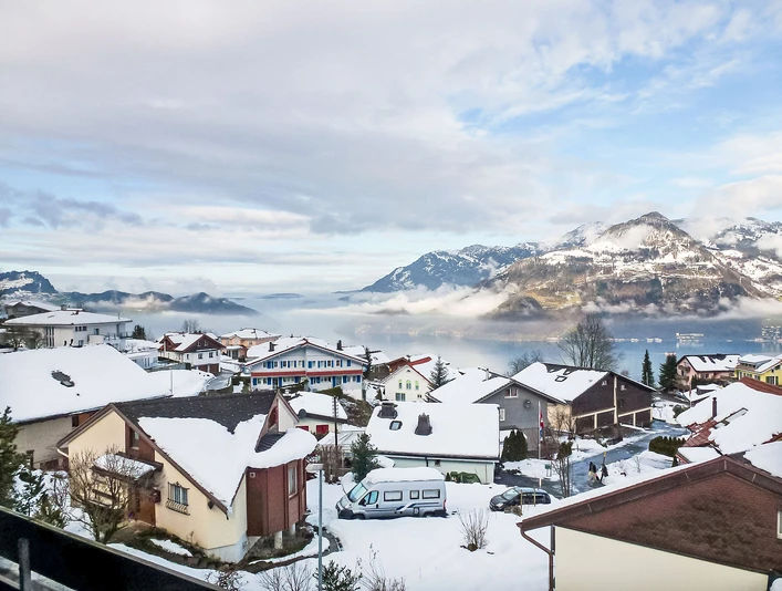 "Ladasa", 2-room apartment 35 m2, on the top floor. Fully renovated in 2019, comfortable and cosy furnishings: living/dining room with 1 sofabed, dining nook and cable TV (flat screen), video and DVD. Exit to the balcony. 1 double bedroom with 1 double bed (160 cm, length 200 cm). Small, open kitchen (oven, dishwasher, 2 ceramic glass hob hotplates, electric coffee machine, raclette grill, fondue Set (cheese)). Shower/WC. Balcony 8 m2. Balcony furniture, deck chairs (1), box-room. Marvellous panoramic view of the lake, the mountains and the countryside. Facilities: iron, children's high chair, hair dryer. Internet (WiFi, free). Parking (1 car) at the house. Please note: non-smokers only.