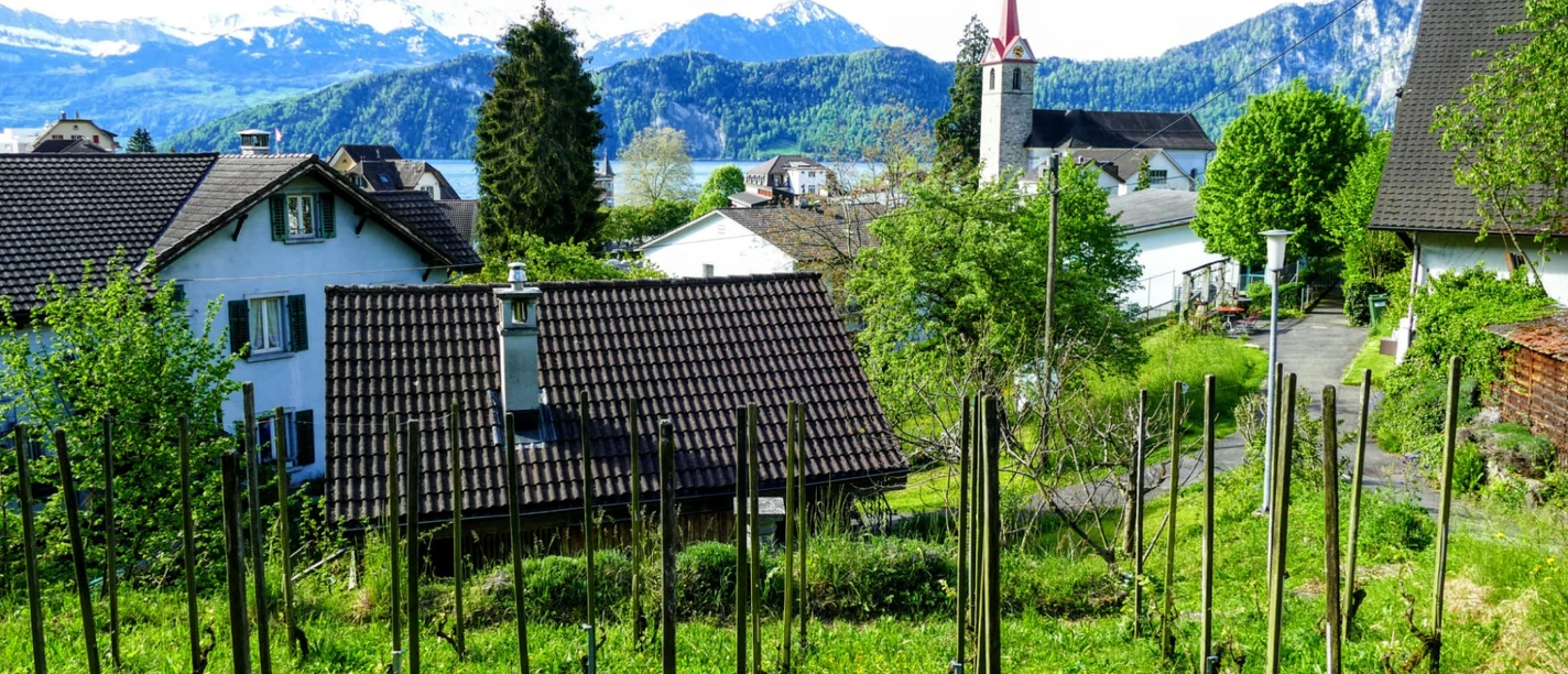 The holiday cottage is located in a romantic garden with a small vineyard, right in the centre of Weggis village. The boat and bus station, shops and restaurants are just a 5-minute walk away. Ideal for two people or a family with two younger children.