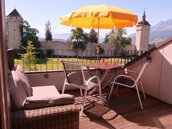Other living room furnishings (living room 1): Cosy living area with sofa and table. Entire flat with parquet flooring. TV available. Internet (w-lan) available free of charge. Access to the private roof balcony with mountain and partly lake view as well as view of the historic city wall of Lucerne.