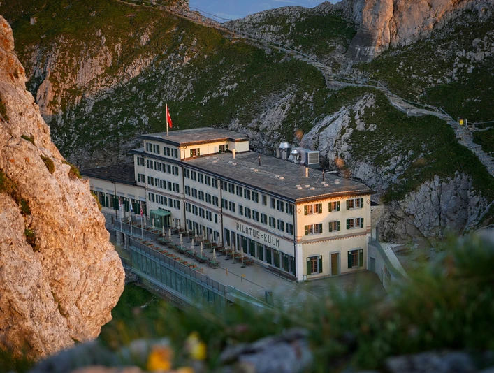 Nowhere are the stars brighter and the sunrises more spectacular than on the Pilatus Kulm. So close to Lucerne, yet an entirely different world. The historic mountain hotel Pilatus Kulm**** was built in 1890 and completely renovated in 2010. It has 27 Superior double rooms and 3 Junior Suites, all with breath-taking views of the Alps. There are a further 20 Standard double rooms at the Hotel Bellevue***. The state-of-the art meeting rooms of the Pilatus Business Center are bright and airy and best suit for events on 2132 meters above sea level. Put the icing on your mountain experience with a cosy dinner and be woken gently next morning by the fantastic sunrise.The mountain hotels Pilatus-Kulm**** and Bellevue*** are located on the summit of Lucerne's local mountain at 2132 meters (7000 feets) above sea level. You can travel to the top of the mountain either from Alpnachstad with the world's steepest cog railway in 30 minutes or from Kriens / Lucerne by gondola. Both valley stations are easy to reach via the motorway.