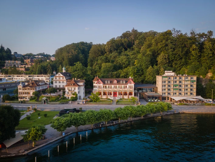 The traditional Hotel Seeburg Lucerne is located directly on the shores of Lake Lucerne and offers spectacular views of the surrounding Alpine panorama. Just a few minutes from the city centre, you can enjoy its location on the waterfront and at the same time its proximity to Lucerne's most popular sights. The "Seeburg" bus stop is located directly in front of the hotel and allows for a relaxed journey. The rooms are comfortable and spacious, and some have a balcony with a view of the lake. The Seeburg restaurant serves Mediterranean cuisine in a stylish atmosphere – from breakfast to dinner. Seasonal highlights complete the offer: In summer, the Sunset Bar directly on the lake invites you to linger, while in the cold season, Swiss specialties such as fondue and raclette are offered in the Titlis Hütte. The Swiss Museum of Transport can be easily reached on foot in 15 minutes. Directly opposite is the "Verkehrshaus Lido" boat station. From here, regular boat connections run across Lake Lucerne in the direction of Flüelen and in the summer months in the direction of Alpnachstad. From Lucerne train station you can reach the Seeburg comfortably by bus in a few minutes. If you arrive by car, there are plenty of paid parking spaces available.