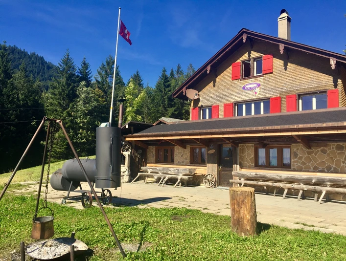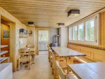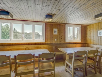 Cosy holiday chalet/group accommodation - ideal for 2 families, max. 13 persons (120 m2). Wonderful valley view to the lake Lucerne. Calm south slope situation. 4 bedroosm (2 rooms with 2 beds, 1 room with 4 beds, 1 room with 5 beds). Common shower/toilet. Kitchen, livingroom. Next to the skilift Handgruobi and starting point of hiking trails. In winter there is a restaurant on the ground floor.