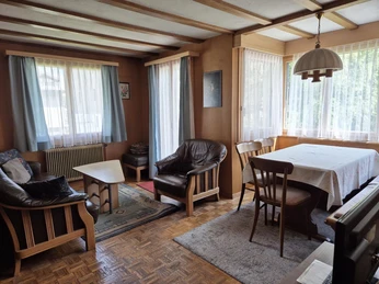 90 m2. More information by the provider: Large chalet (approx. 90 m2) for 5-7 persons, centrally located with level driveway, on the sunny side. Sport facilities and cable cars may be easily reached on foot. free WIFI. Pets allowed. 4 room apartment, detached-house: living/dining room, 1 double bedroom, 1 2-bedded room, 1 room with bunk bed and 1 extra bed, kitchen, bath-toilet, shower-toilet. Included: bath-and kitchen towels, local tax.