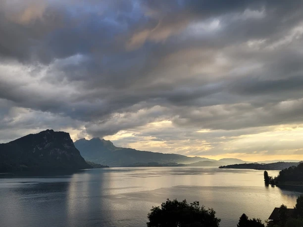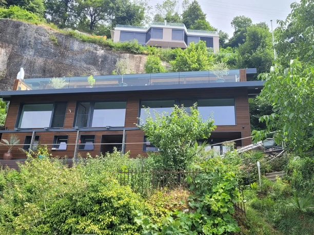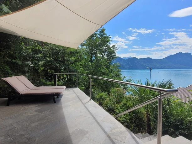 A lovingly furnished holiday flat with a large terrace and spectacular lake view surrounded by greenery is located in the renovated and energy-efficient Minergie house. The furnishings are high quality and well cared for, and the terrace is furnished with comfortable chairs around a small dining table and two wooden loungers for relaxing outdoors. A dishwasher does the washing up in the kitchen and there are other useful electrical appliances. Palm trees and large deciduous trees grow in our natural garden on a south-facing slope, and the well-insulated house is pleasantly cool even when it's very hot. The quiet village of Unterwilen lies on the lake and has a fine pebble beach. The water is crystal clear and has a pleasant bathing temperature of 22-24 degrees in summer. From the house down to the lake and the bus stop you walk about 3 minutes.