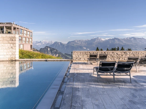 Bathing has been a theme on "Rigi Kaltbad" for 600 years. In the past, it was the healing spring of the "cold bath" that attracted guests from all over the world to this unique place. Since July 2012, this tradition has been continued with the new Mineralbad & Spa Rigi Kaltbad, designed by the internationally renowned architect Mario Botta, with a water temperature of 35° C. Let yourself be enchanted by the stunning architecture with a stone wall over 30 meters long with niches and the unique location in the middle of the mountains. Enjoy a unique wellness experience with no time limit.