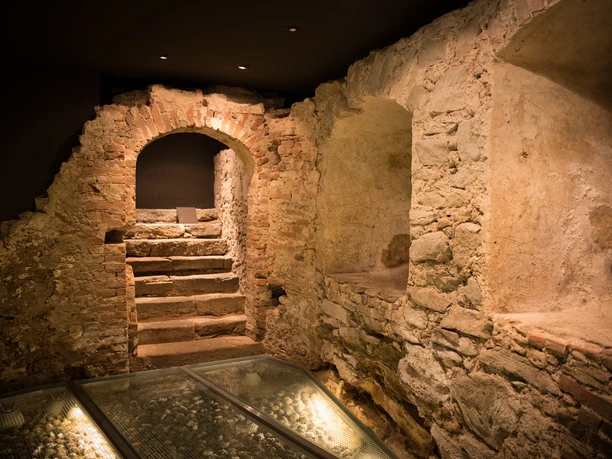 The cellar, with its original preserved floor made of tightly packed Bollenstein stones and the historic embrasure windows, which once looked out onto the town moat that no longer exists today, is a unique testimony to medieval architecture. A walk-on glass floor was installed in the area of the Bollenstein floor, providing a view of the original floor covering.