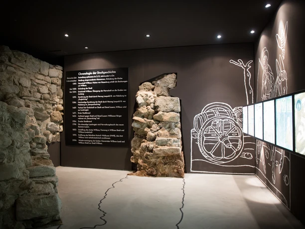 The modernized archaeology cellar in the Schlossschüür Willisau has been open again since February 2025. After almost 15 years, renovation was necessary: the masonry was cleaned, stabilized and the media system renewed. Short films and slideshows are shown on the large screen, bringing the town's history to life.