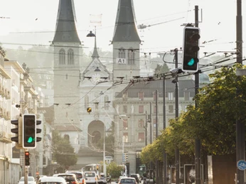 The Church of St. Leodegar is the sacred centre of the St. Leodegar and St. Maurice college of canons. The church was destroyed by fire in 1633, leaving only the two towers with their Romanesque elements. The interior of the edifice features a number of different influences. The high altar is fashioned from black Unterwalden marble.