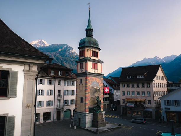 The lime tree on today's Rathausplatz had become weak in the 16th century, whereupon the village bailiff Bessler had a stone fountain built in 1567. A similar fountain with a statue of Tell was placed at today's entrance to the church square. Both fountains marked the alleged positions of Tell and the boy at the apple shooting.