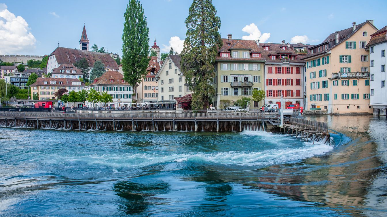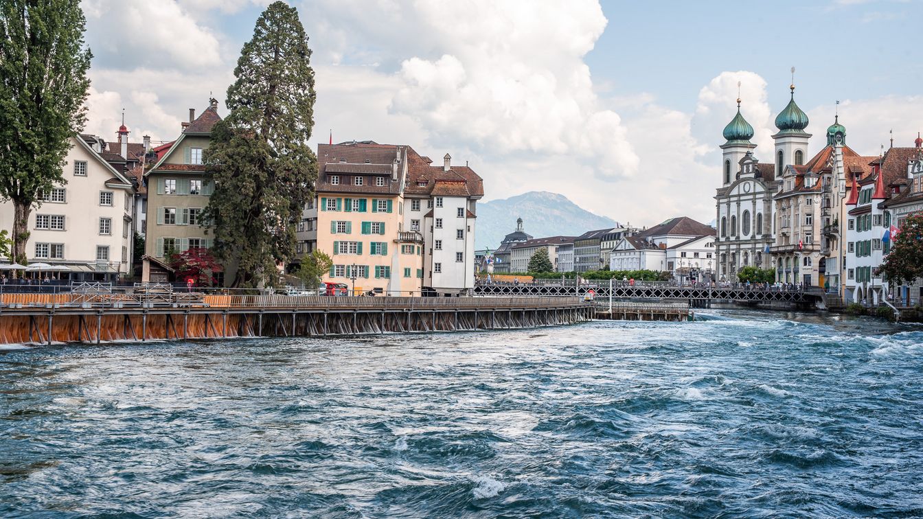 From the Spreuer Bridge, there is a fascinating view upstream: the Needle Dam (also known as the Reuss Weir). Built between 1859 and 1861, the weir is a historical monument and marvel of 19th century engineering.