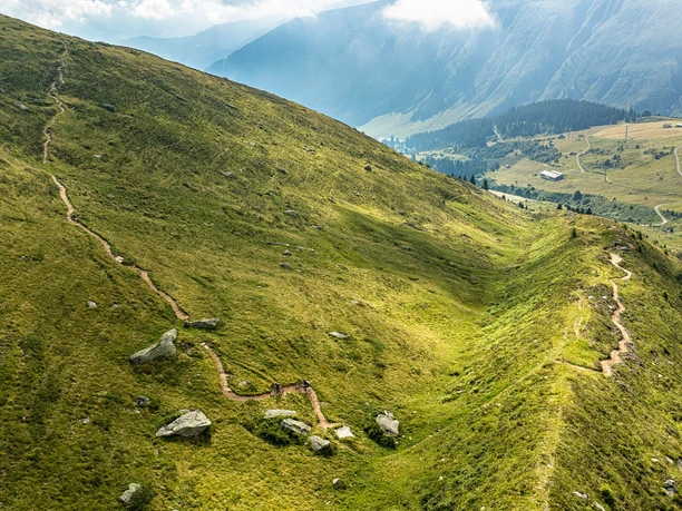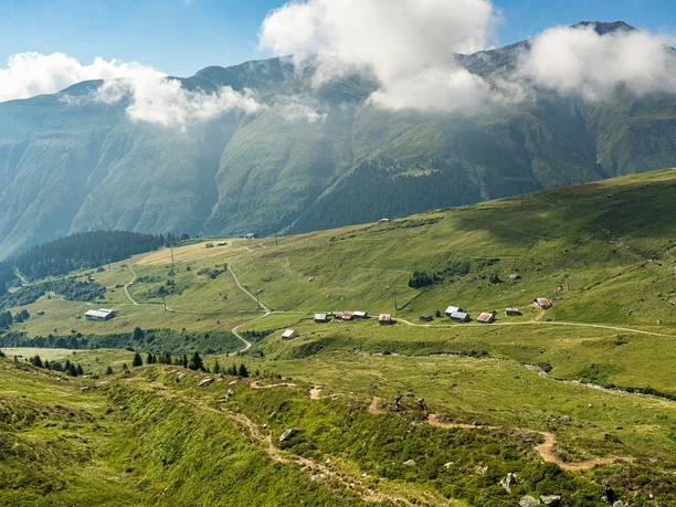 The descent to Alp Malamusa through the forest on a trail is all the faster! After crossing the Milar stream, the path leads above the valley floor back to the starting point at Sedrun.