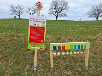 From the village center, the adventure trail leads along the Mutterkuh Schweiz farms run by Beat Huber, Thomas Schwegler, and Severin Walther, who produce Natura-Beef from suckler cow husbandry. Along the way, you will therefore encounter a variety of breeds such as Grauvieh, Simmental, Limousin, Braunvieh, and various crosses. With nearly 40 recognized breeds, Mutterkuh Schweiz contributes significantly to breed diversity in Switzerland. Upon reaching the destination, signposts lead along the circular route back to the starting point. Now, in addition to suckler cows, dairy herds and cattle can also be seen. At the penultimate station, you will learn something about the different herds. If you have paid good attention, you can now distinguish cows, calves, and cattle on the way.