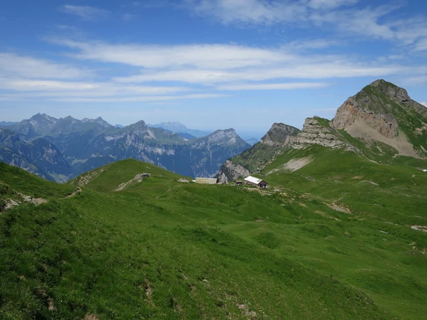 On the Eggberge (1447 m), we enjoy the wonderful mountain panorama and the wide view into the Pre-Alps, then follow the service road up to Angelingen Kreuzegg. At this fork, the route climbs to the well-visible mountain cross and leads us further through the lightly forested nature reserve to Hüenderegg (1873 m). On a gently descending path, we reach in a hollow the popular Fleschseeli and then hike to Chalberweid, from where the path leads up to the forest edge and continues to Schön Chulm (2022 m). The landscape change shows the contrasts between the steeply rising Rossstock, past Siwfass and Hagelstock to the highest point at 2140 m and the softness of the Pre-Alps with views to Spilauer Seeli. After a lengthy lunch break, we walk down over alpine pastures into the hollow to Spilauer Seeli and enjoy a cool drink half an hour later in the cozy Lidernenhütte SAC (1727 m).