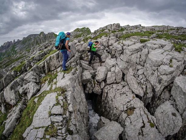 Adventurous people can bypass the Gamperstock on the north side, without too much altitude loss, after Chinzig Chulm towards the southeast on the old, partly unmarked and unpaved alpine path over the «Geissgrätlichrächen» - a sensational limestone landscape.