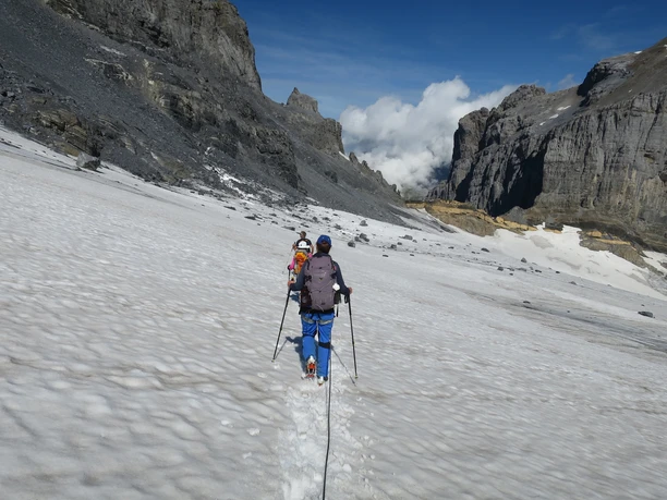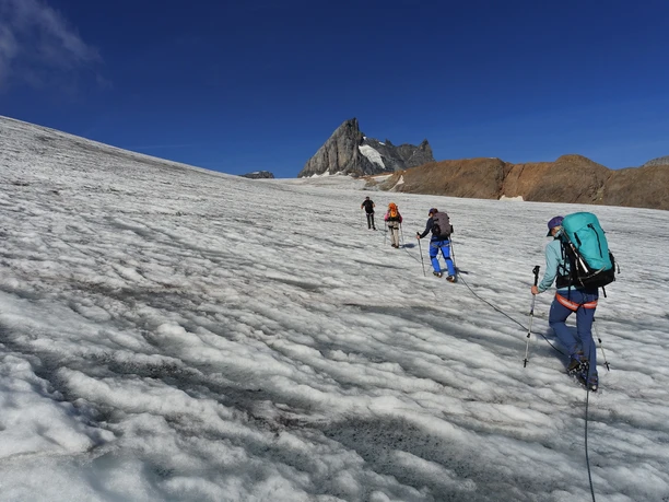 From the Kröntenhütte SAC (1903 m) the path leads level to the Obersee, crosses the outflow over a bridge, and climbs right towards the Oberseemännli. Before the last rise, the route branches left towards the ridge, which we follow to the cairn on the Graw Stock (2453 m). The path continues over smoothly polished rocks and firn fields to the upper Graw. Ahead of us lies the vast glacier of the Glatt Firn, which we traverse roped in the next hours in a slight left curve towards the western rock ribs of the Schwarzstöckli. A fascinating high mountain world surrounds us. The steep walls of the Schlossberg drop vertically into the depths. The weathered towers of the Spannort group provide a unique mountain experience.