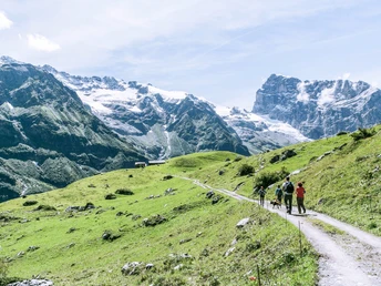 On the original route (short individual excursions are also possible), you start at the monastery demonstration cheese dairy and walk on the gently ascending hiking trail to Untertrübsee. From the first stop at the Alp Untertrübsee with a panoramic view of the mountains, you cross over to the alpine cheese dairy Gerschnialp. Then follows the descent through the forest to Engelberg. Along the Engelberger Aa, the trail continues on easy paths to the alpine cheese dairy Stäfeli. In the middle of the impressive mountain scenery, there is a detour towards Surenenpass up to Blackenalp. Then it continues with a slight ascent to the alpine cheese dairy Surenen. Over the highest point of the hike, the Fürenalp, it goes downhill to Horbis, before the stony path over the Schletteren brings you to the sunny side of the valley. There await the two alps Hüetismatt and Langenboden. Then you walk back via Bränd, Spisboden, Heg and Bergli to Engelberg.