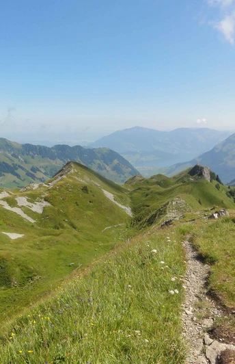 The historic Ächerli Pass has given and still gives rise to various speculations and teasing between the people of Nidwalden and Obwalden, which originate from Napoleon's French invasion of Nidwalden in 1798. It is the starting point of a scenic circular hike. From point 1427, the mountain trail leads over the Alp Chieneren up to the Arvigrat. A varied natural landscape with a wide variety of flowers and rich in butterflies amazes the hikers. Always staying on the ridge, which forms the border between Obwalden and Nidwalden, heading south, you reach the highest point of the Arvigrat at 2014 m above sea level. A magnificent panoramic view offers deep views into the Engelberg and Sarneraa valleys as well as distant views of the Pre-Alps and Alpine ranges. This view extends over the Nidwalden, Engelberg, and Obwalden peaks far into the Bernese and Vaud Alps and even to the Jura.