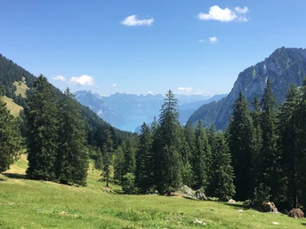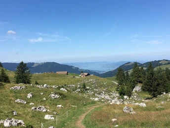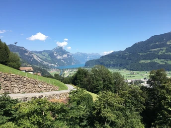 The ascent is long but manageable. First on paved side roads, later on gravel roads the path steadily goes upwards. Before the border crossing on Rossweidhöchi, you have to carry or push the bike for about 500 meters because the ground is swampy. Then the road leads first on gravel, later from Mettmen on paved road back down into the valley.