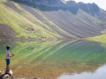After marveling, photographing, and enjoying, the hike starts, the descent towards Eisee is somewhat steep but the view is simply fantastic. At the natural jewel Eisee, a longer break is really worth it. Whether having coffee or lunch at the cozy mountain inn Eisee or a picnic right at the lake—you experience pure mountain idyll here! The Eisee is popular with fishermen. Rainbow trout, brook trout, and char can also be fished here with a day permit.