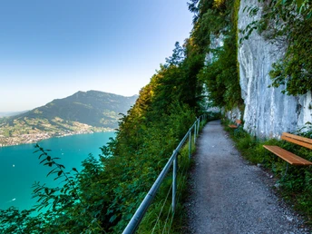 At the Bürgenstock Resort, you follow the first section of the cliff path. After around 45 minutes of walking, you reach the valley station of the Hammetschwand Lift.